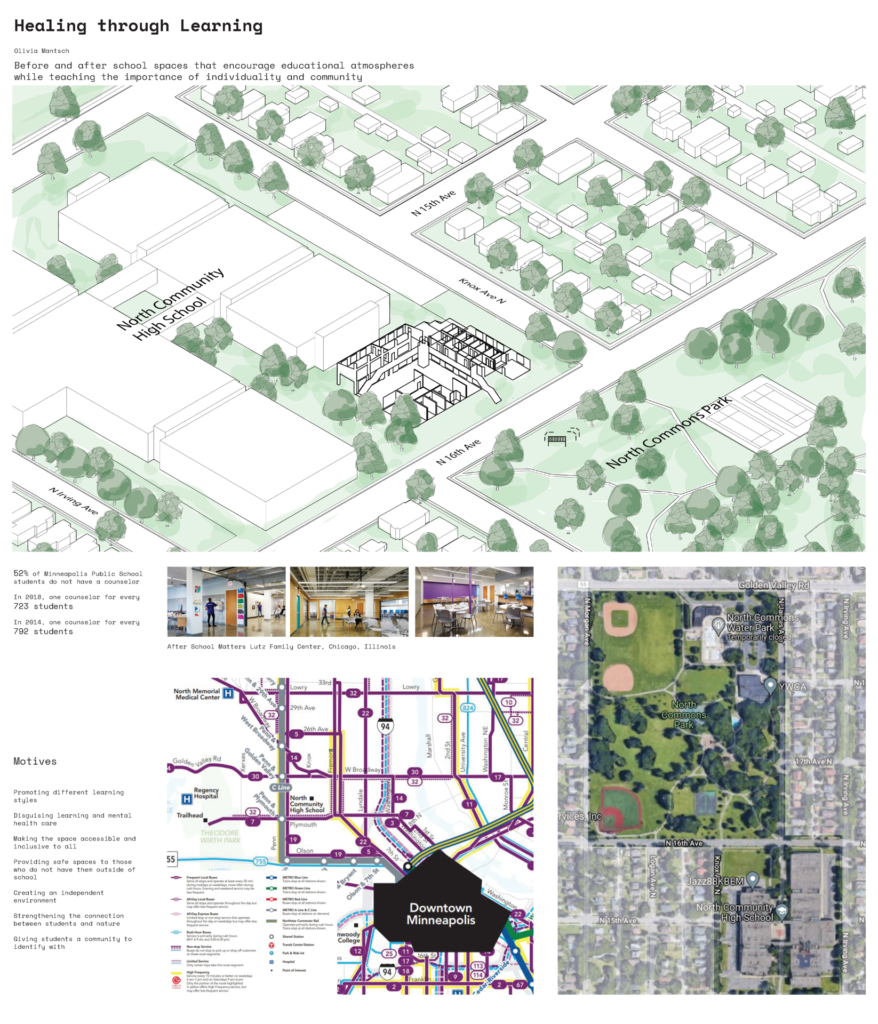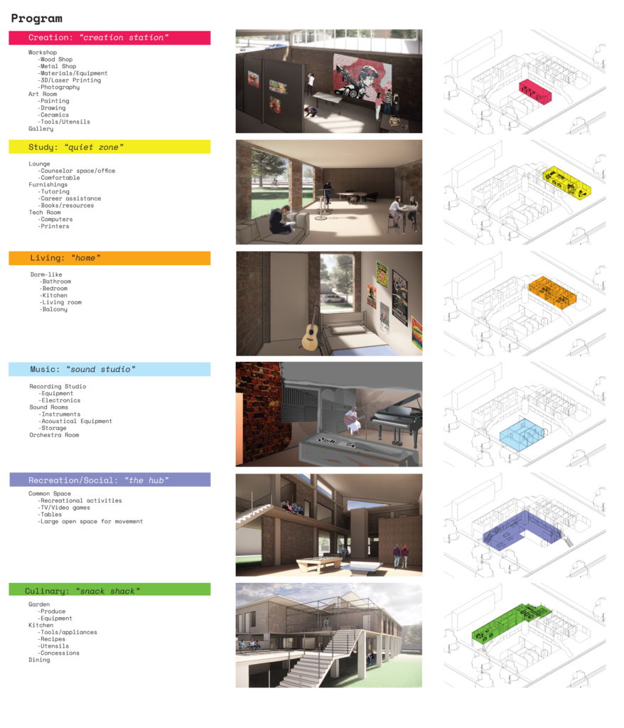 The Healing through Learning program offers a safe and collaborative space for youth when school is not in session. Its location next to the North Community High School, where many neighborhood young people attend high school, and its corridor design promotes connection to the adjacent North Commons Park with its large recreational area. While there are several existing activities available to students within the school, many spaces are only available during school hours.
