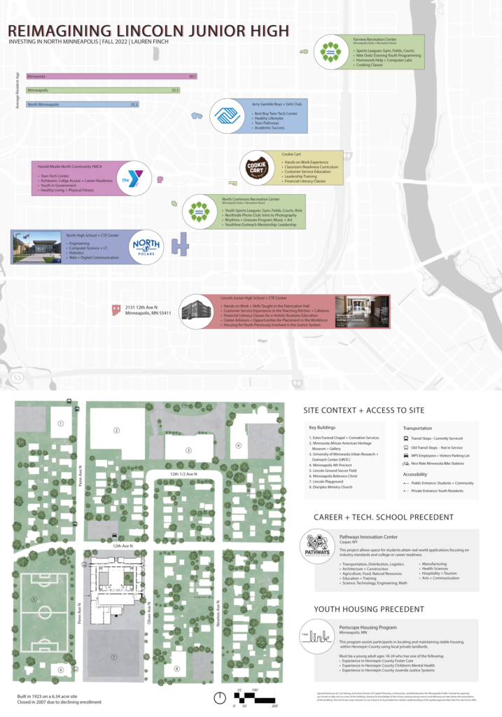 North Minneapolis has a very young population in comparison to the rest of the city and state and as a result, there is ample programming for elementary aged youth. However, minimal activities and programs for high school aged students exist within the community. This project serves to provide a space for students to learn, work, and serve their community. Careful consideration was taken when choosing a site for this program. Community members brought to our attention that the Lincoln Junior High School has sat primarily unused since 2007 when it was forced to close due to declining enrollment.