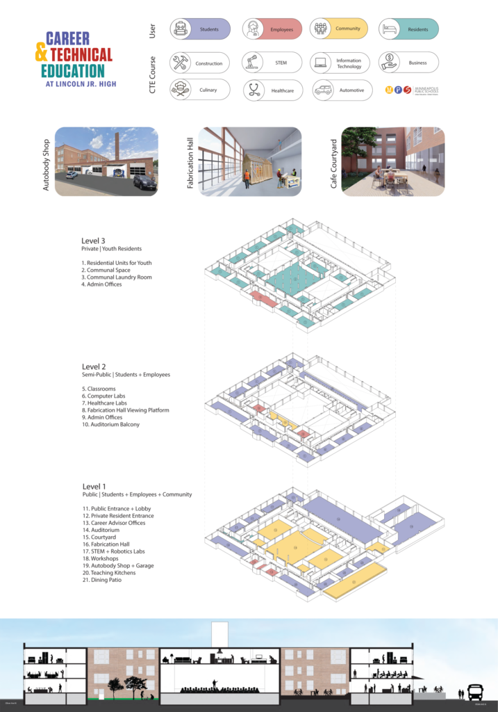 The three-story, 1923 building may be empty, but it is full of potential to be reprogrammed as an asset for the community. This project proposes that a variety of skills and employment opportunities will be taught throughout the first two floors of Lincoln in a Career and Technical Education setting to high school youth and post high school young adults. Additionally, the third floor will provide housing units specifically for youth who have previously been involved in the justice system and they will have access to training and employment on the lower two floors. The overall goal is for the Lincoln School to once again be a place for learning in the community.
