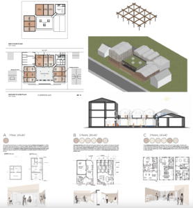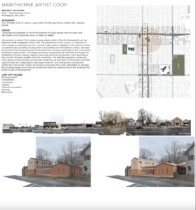 We envision a project that creates space where artists of North Minneapolis can live together while engaging in their craft. The Hawthorne Artist Coop is a collection of nine residences arranged around a central maker-space available to all members of the cooperative. By providing housing that is accessible and affordable to artists, we hope to promote financial and physical empowerment, increase ownership in the community, and build creative skills. The design prioritizes sustainable self-sufficiency through the integration of solar energy, organics recycling, and food production, thus decreasing