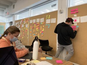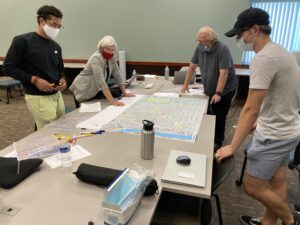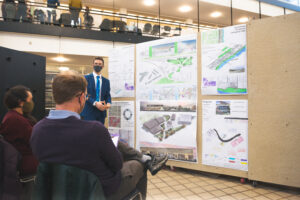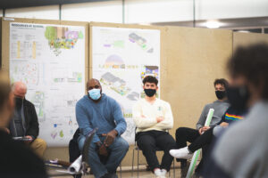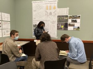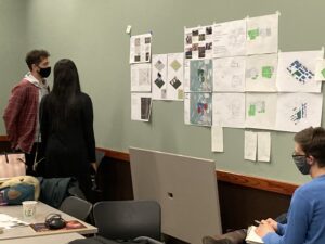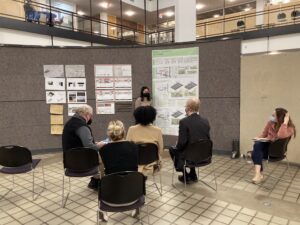 The fall 2021 semester Northside Community Connection project took place during the second year of COVID. For this reason, community meetings and reviews happened in the Zoom format. We were able to make site visits that were out-of-doors. We held Wednesday classes and several reviews in person with masks at the Robert E. Jones University Research and Outreach-Engagement Center (UROC). Several other reviews with masks were held at Rapson Hall at the University of Minnesota. These Rapson reviews included design professionals and researchers, and for several, community members who were able to attend. We had three reviews that included interns including young people from the Connection to Independence organization.